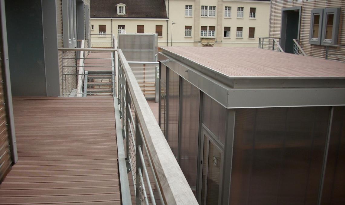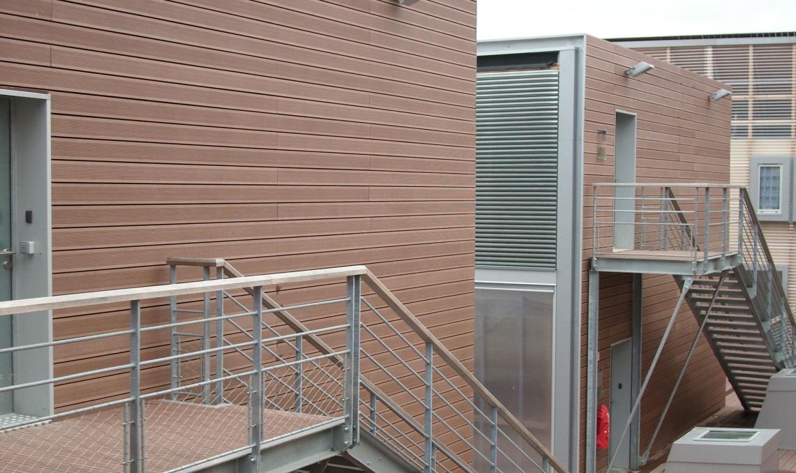 En 2008, le campus universitaire de Troyes a fait le choix d’un habillage de façade contemporain et durable en optant pour les lames de terrasse en bois composite Silvadec. C’est la lame Élégance, coloris brun exotique, qui a été retenue pour revêtir les façades de ce bâtiment à l’architecture moderne et épurée.