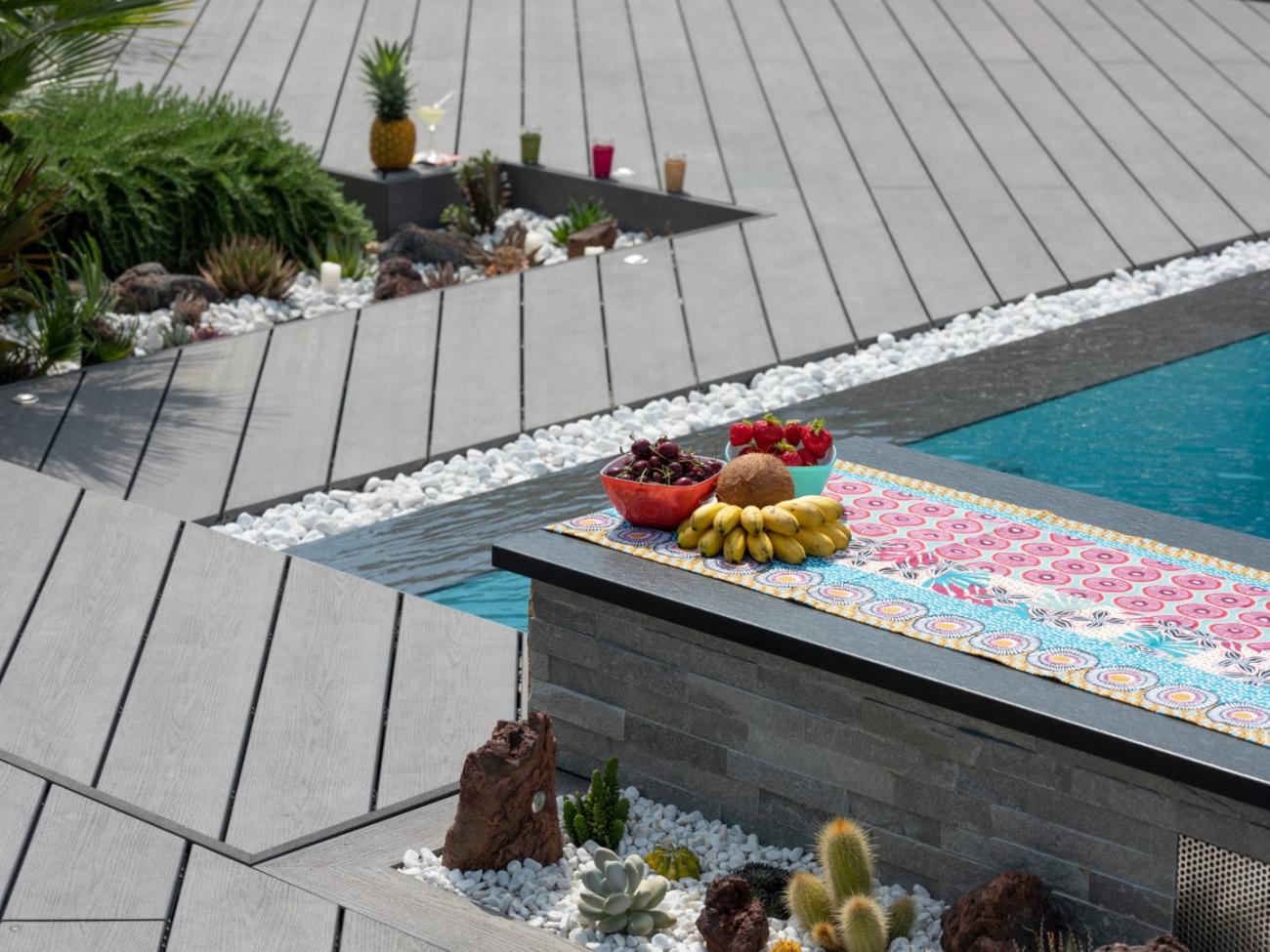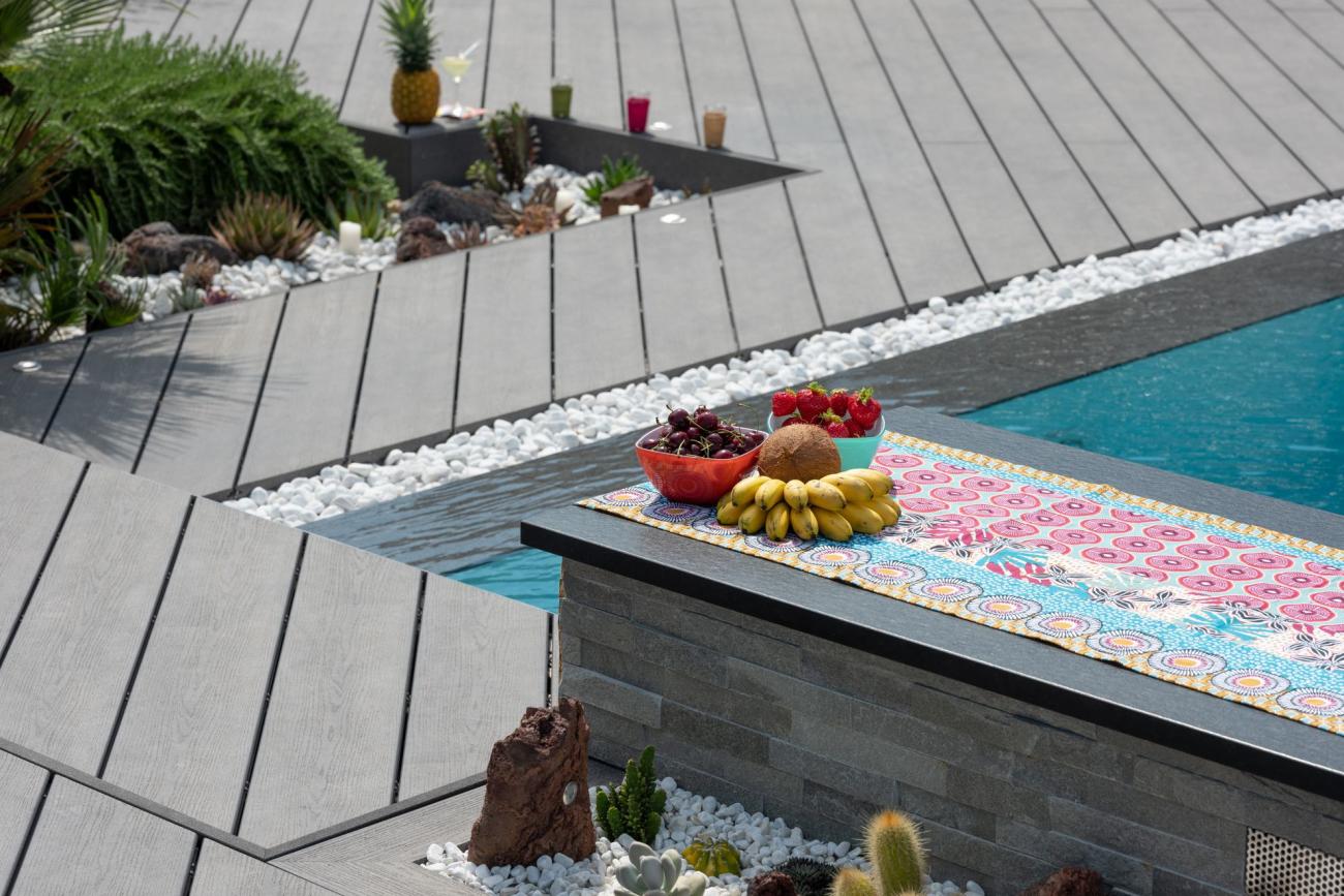 Notre lame structurée est une lame de terrasse composite pleine (non alvéolaire). Il est donc possible de la travailler comme une lame de terrasse bois : laissez parler vos envies pour imaginer votre espace extérieur !